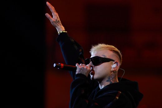 Rapper Lazza opens the event called "Tra Palco e città" at the Suzuki Stage, during the 74th edition of the Sanremo Song Festival. Among the songs sung also "Cenere", with which he ranked second last year. Rap music now represents a form of art, redemption and economic fulfillment for many young musicians in Europe and around the world. Photos are available for editorial use.